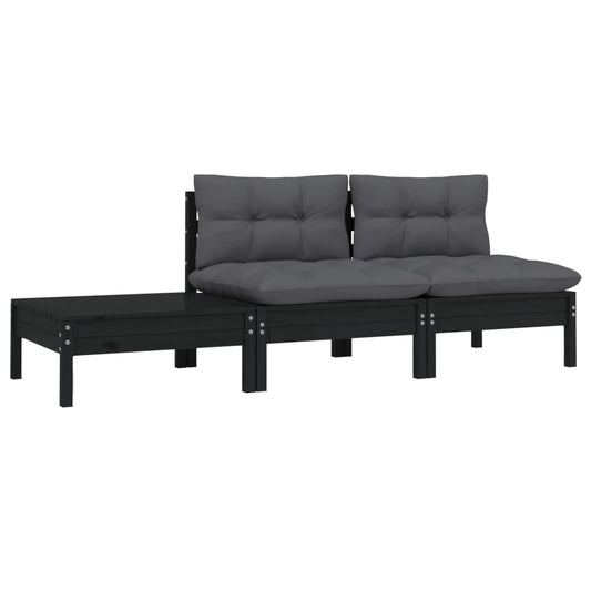 3-tlg. Garten-Lounge-Set mit Kissen Schwarz Kiefer Massivholz
