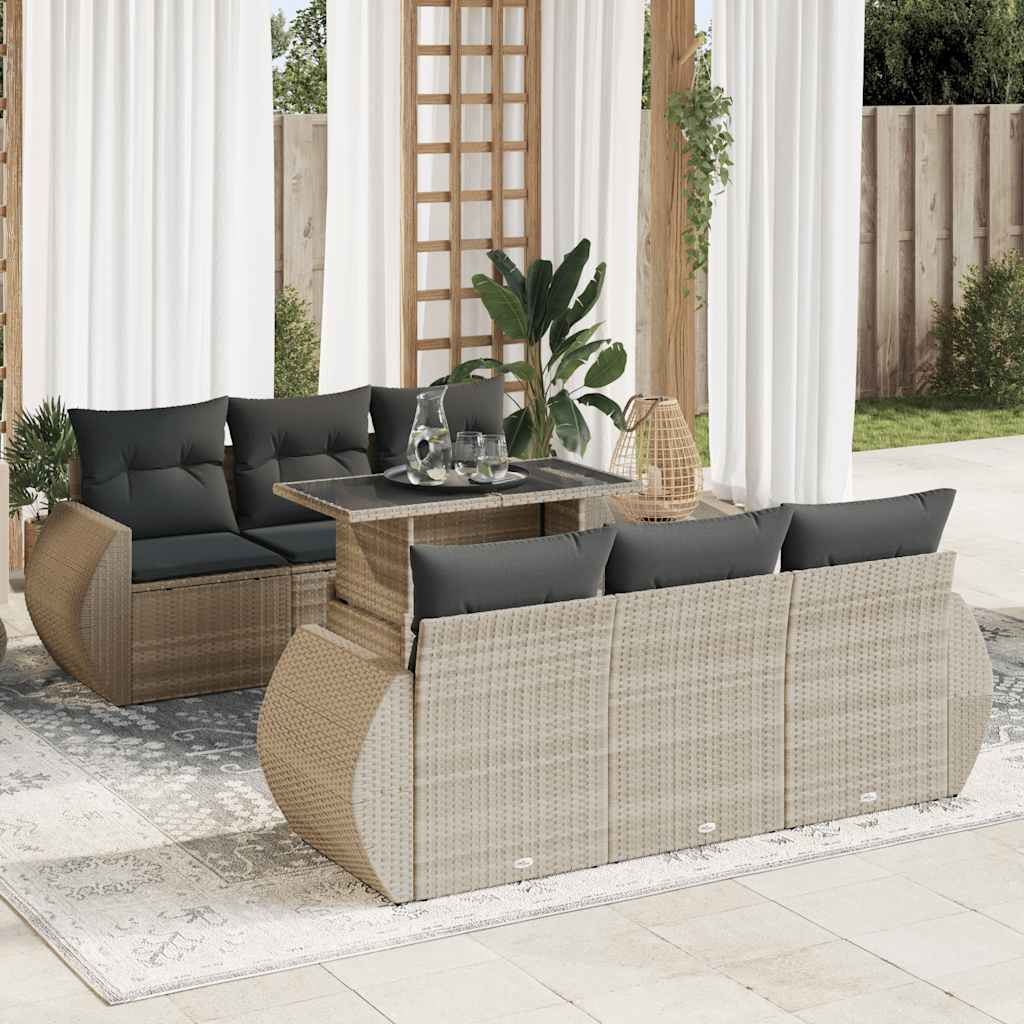 Diese Garten-Sofagarnitur ist die perfekte Ergänzung zu deinem Garten, deiner Terrasse oder deinem Innenhof. Sie bietet einen bequemen und einladenden Platz, um mit Familie und Freunden zu plaudern oder dich einfach nur zu entspannen und das Leben im Freien zu genießen. Langlebiges Material: PE-Rattan, auch als Poly Rattan bekannt, ist ein robustes, pflegeleichtes synthetisches Material, das die Optik von natürlichem Rattan aufweist. Es kennzeichnet sich durch ein geringes Eigengewicht und lässt sich einfach reinigen. Aufgrund seiner Haltbarkeit und Witterungsbeständigkeit wird es häufig bei der Herstellung von Gartenmöbeln verwendet.Stauraum mit wasserfestem Beutel: Jedes Gartensofa verfügt über ein Staufach unter der Sitzfläche, das mit einem wasserfesten Beutel zur Aufbewahrung von Kissen, Spielzeug und anderen Gegenständen versehen ist. Die Kissen sind mit Bezügen versehen und lassen sich mit Klettverschlüssen fest und sicher am Sofa befestigen.Verstellbare Tischplatte: Die Tischplatte lässt sich anheben, um den Gartentisch höher zu machen und ihn von einem Couchtisch in einen Esstisch zu verwandeln. Er eignet sich daher perfekt für Gäste oder Mahlzeiten im Freien.Abnehmbarer und waschbarer Bezug: Diese Sitzkissen verfügen über abnehmbare Bezüge für einfaches Waschen und Pflegen.Robustes und stabiles Gestell: Der pulverbeschichtete Stahlgestell ist stark, stabil, langlebig sowie korrosions- und wetterbeständig, um eine lang anhaltende Leistung zu gewährleisten. Gut zu wissen:Wir empfehlen dir, deine Gartenmöbel mit einer wasserdichten Hülle zu schützen, um lange Zeit eine ansprechende Optik aufzuweisen.