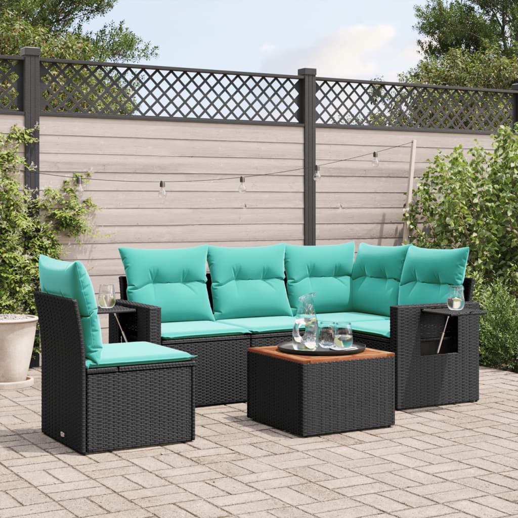 6-teiliges Gartensofa-Set mit Kissen, schwarzes Polyrattan