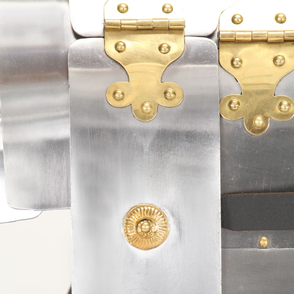 Dieser Brustpanzer in Antik-Optik ist perfekt für LARP (Live-Action-Rollenspiel), Cosplay, Partys mit historischem Thema, Halloween-Party, Theaterrequisiten und historische Nachstellungen (reenactment) und würde sich ebenfalls gut als Ausstellungsstück machen. Dieser Brustpanzer ist eine exakte Nachbildung einer original römischen Legionären-Rüstung, bekannt als Lorica segmentata, die sowohl die Vorderseite als auch den Rücken schützt. Er ist vollständig tragbar und mit verstellbaren Lederriemen für eine bequeme Passform ausgestattet. Der Brustpanzer kombiniert den Stil der Antike und robuste Materialien zu einer auffälligen Rüstung. Darüber hinaus ist er aus Stahl der Stärke 18 mit poliertem Finish gefertigt.