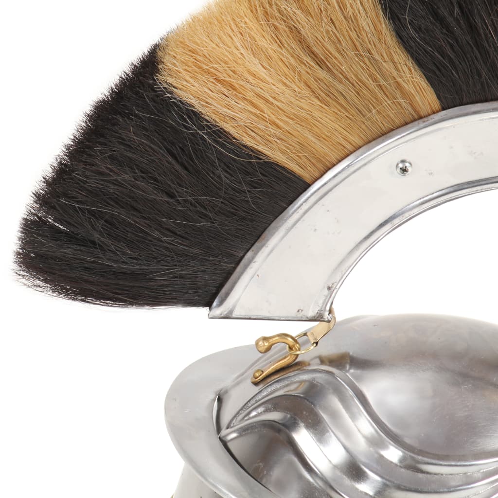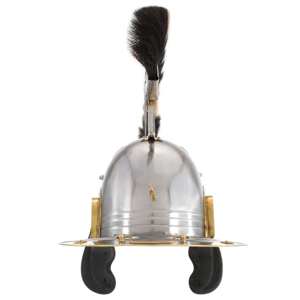 Dieser Helm in Antik-Optik eignet sich hervorragend für LARP (Live-Action-Rollenspiel), Cosplay, Partys mit historischem Thema, Halloween-Party, Theaterrequisiten und historische Nachstellungen (Reenactments). Der Helm ist eine exakte Nachbildung eines original römischen, mittelalterlichen Soldatenhelms. Gefertigt aus Stahl der Stärke 18 kombiniert er mittelalterlichen Stil und robustes Material zu einem eindrucksvollen Helm, der perfekt zu Ihrer Rüstung passt. Der Paradehelm verfügt über eine abgerundete Oberseite und zwei seitliche Wangenschoner, die sich aufklappen lassen. Mit seinen fortgeschrittenen Schutzfunktionen und den Federn schütz er den Kopf des Trägers auf beste Weise, ohne störend zu sein. Darüber hinaus ist er auch ein attraktives Ausstellungsstück.