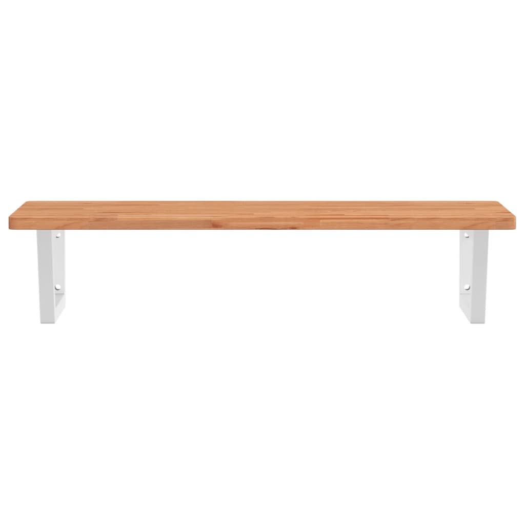 Die Waschtischplatte wird sicher an der Wand befestigt und bietet eine elegante und platzsparende Lösung für dein Badezimmer. Robust und langlebig: Dieses Waschbeckenregal besteht aus einem Stahlgestell und einer Oberplatte aus massivem Buchenholz, was es robust, stabil und langlebig macht. Platzsparend: Die schwebende Waschtischplatte bietet reichlich Platz für das Waschbecken, Seifen, Cremes sowie andere Kleinigkeiten. Dank der Trapezform kannst du Handtücher oder andere Dinge platzsparend an der Halterung aufhängen. Einfache Verwendung: Die Holzplatte ist nicht vorgebohrt, so dass dein Waschbecken je nach Bedarf links, rechts oder mittig installiert werden kann. Dank der vorgebohrten Löcher in der Halterung kann diese einfach mit der Tischplatte montiert und an der Wand befestigt werden. Vielseitige Anwendungsmöglichkeiten: Dank ihres modernen Designs fügt sie sich in verschiedene Arten von Bädern ein. Gut zu wissen:Die Schrauben sind nicht im Lieferumfang enthalten. Du kannst die Schrauben auf der Grundlage der unten aufgeführten Informationen separat erwerben. Wandbefestigung: 2 Stück M8-Dehnschrauben pro Halterung Holzplatte: 2 Stück M5x18-Schrauben (T=2) oder 2 Stück M5x20-Schrauben (T=2,5/4 cm) pro Halterung