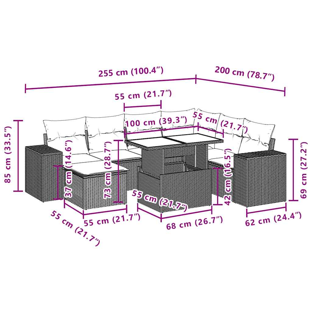 8-teiliges Gartensofa-Set mit Kissen, schwarzes Polyrattan