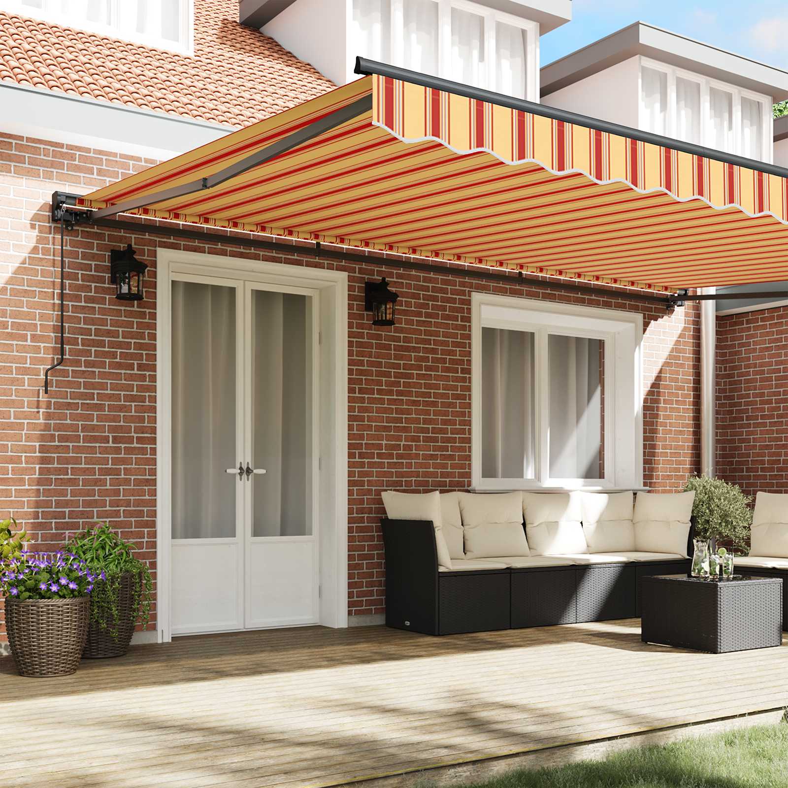 Diese stylische einziehbare Sonnenschutz-Markise verbessert sowohl die Optik als auch die Funktionalität deiner Außenbereiche. Perfekt, um schattige Plätze auf Balkonen oder Terrassen zu schaffen, bietet sie einen geschickten Übergang von offen zu zugezogen. Das elegante Design passt zu unterschiedlichen Außenstilen, ideal für zuhause oder für Unternehmen. Hochwertiger Stoff: Die Markise besteht aus erstklassigem Material, das UV-Strahlen, Wasser und Verblassen abwehrt. So bleibt sie auch nach viel Sonne schick. Das Material fühlt sich angenehm an und hat einen luxuriösen Effekt, ist aber gleichzeitig praktisch für draußen. Verstellbarer Winkel: Mit einem nützlichen 10-Grad verstellbaren Winkel kannst du die Markise so einstellen, wie du es brauchst, um den besten Schatten zu bekommen. Sie passt sich der Sonnenposition an, damit du den ganzen Tag über komfortabel bist. Funktionales Design: Die einziehbaren Teile verbinden Stil mit Praktikabilität. Wasserabweisende Materialien halten dich trocken, wenn das Wetter mal unbeständig ist und geben dir die Kontrolle über deinen Außenbereich für eine entspannte Zeit. Vielseitige Nutzung: Diese Markise ist ganz auf Außenbereiche ausgelegt und perfekt für Balkone und Freiluftbereiche. Ihre Flexibilität macht sie geeignet für die unterschiedlichsten Nutzungsmöglichkeiten, ob zum Entspannen, Essen oder für gesellige Abende. Einfache Wartung: Eine schnelle Reinigung mit kaltem Wasser und das Festziehen der Schrauben sorgen dafür, dass sie lange hält. Vermeide scharfe Chemikalien, um das Material und das Aussehen zu erhalten, was die Pflege einfach macht und sie über die Jahre hübsch bleibt.