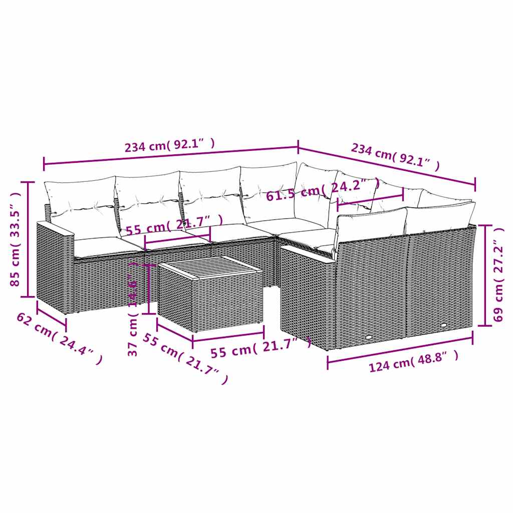 9-teiliges Gartensofa-Set mit Kissen, schwarzes Polyrattan