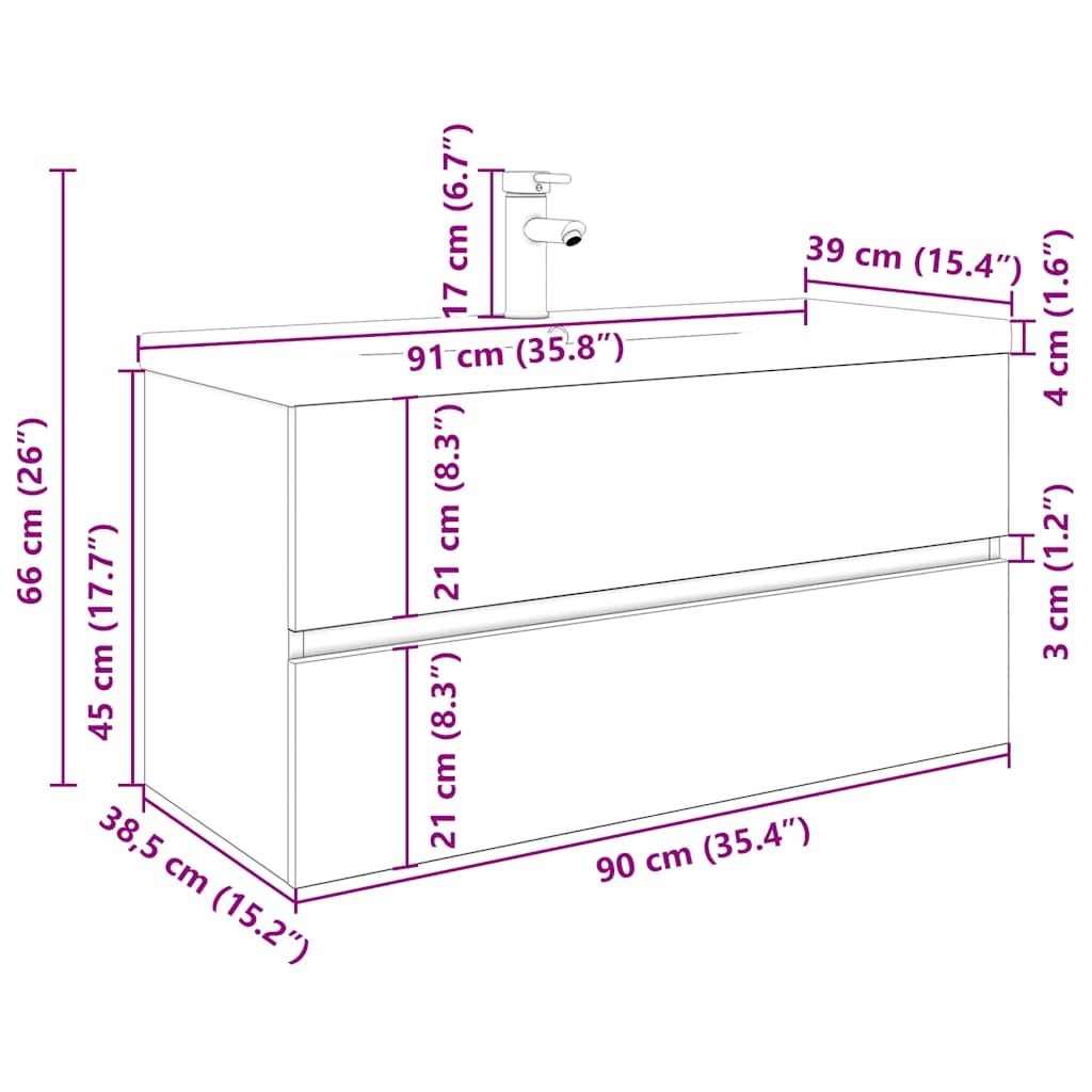 Dieser stilvolle Badezimmerschrank mit Einbaubecken und Wasserhahn bietet viel Stauraum und ist eine ausgezeichnete Ergänzung zu deinem Badezimmer, da er für Ordnung sorgt und eine markante Optik aufweist! Robustes Material: Der Unterschrank besteht aus Holzwerkstoff, einem Material von außergewöhnlicher Qualität mit glatter Oberfläche, das sich durch Festigkeit, Stabilität und Feuchtigkeitsbeständigkeit auszeichnet.Viel Stauraum: Der Waschbeckenunterschrank verfügt über eine Schublade und bietet dadurch viel Stauraum für die Aufbewahrung verschiedener Sachen in deinem Badezimmer.Praktisches Design: Auf der Oberseite dieses Badschranks findet dein Waschbecken den idealen Platz.Wandmontage: Der Badezimmerschrank lässt sich an der Wand montieren, um zusätzlichen Stauraum zu schaffen. Auf diese Weise kannst du deine Stellfläche maximieren und leichter für Ordnung sorgen.Überlauffunktion: Ein Überlauf sorgt dafür, dass das Wasser abfließt, wenn das Waschbecken zu voll wird. Gut zu wissen:Schrauben und Dübel für die Wandbefestigung sind nicht enthalten. Suchen und verwenden Sie die für Ihre Wände geeigneten Schrauben und Dübel. Wenn Sie unsicher sind, suchen Sie professionelle Hilfe. Lesen und befolgen Sie jeden Schritt der Anleitung sorgfältig.Wasserhahn und Ablauf mit Überlauffunktion sind im Lieferumfang enthalten.Es handelt sich um eine Warm- und Kaltwasser-Armatur. Für Warmwasser ist der Anschluss eines Warmwasserbereiters erforderlich.